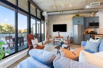 Inside, the open-concept living, dining, and kitchen areas create a seamless space to entertain and unwind. A new custom kitchen features sleek cabinetry, integrated lighting, a new fridge and hood range/microwave.The living area flows effortlessly, highlighting the airy design and unique loft details, featuring custom-designed Vitsoe 606 modular shelving that adds both style and function.
