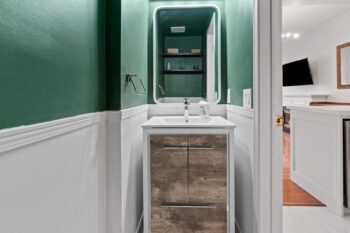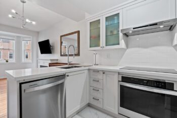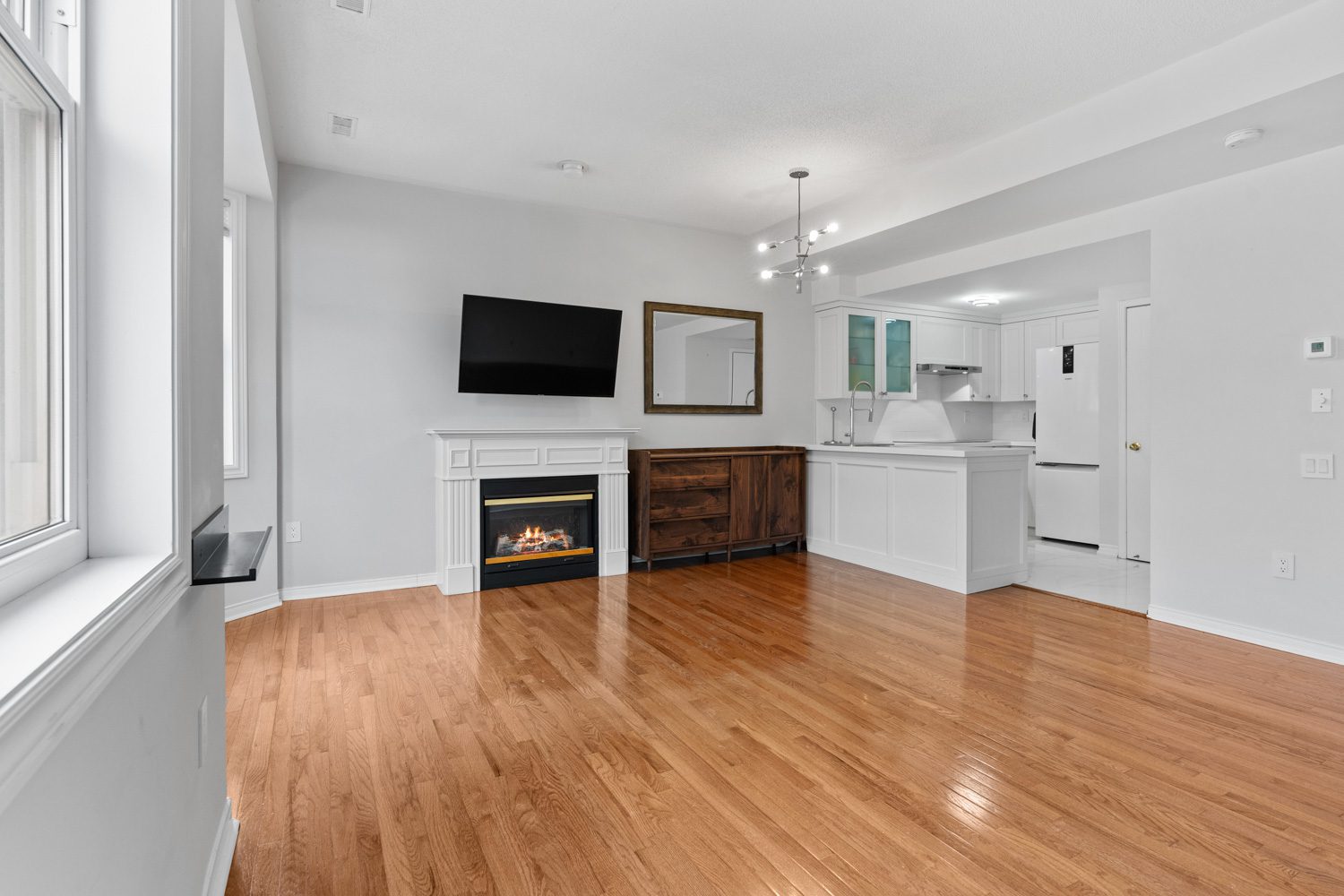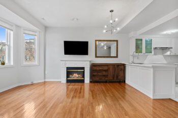 The main living area features warm hardwood floors, large windows that fill the space with natural light, and a cozy fireplace that anchors the room. The open, newly renovated kitchen is finished with white cabinetry, stainless steel appliances, and a breakfast bar overlooking the living and dining area, perfect for everyday living or hosting friends. A newly renovated main floor powder room adds extra convenience.